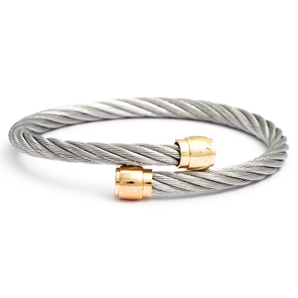 這款優雅的手鐲是藝術總監Coralie Charriol-Paul的簽名作品,是對凱爾特人扭力的現代翻新。我們的標誌性編織鋼索由低過敏性不銹鋼和鈦製成,並採用男女通用的開柄設計,並配有拋光的鍍玫瑰金尾端。這款永恆的單品既時尚又時尚,可以調節以找到最合適的款式。