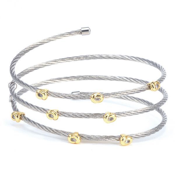 這款絢麗奪目的華麗鍍金黃色銀手鐲,以我們標誌性的不銹鋼雙絞線絞在一起,並飾有有機圓形圖案。八顆珍貴的白色托帕石寶石在整個設計中熠熠生輝,並以年輕女性氣息栩栩如生。模仿豪華風格中的時尚堆疊效果。