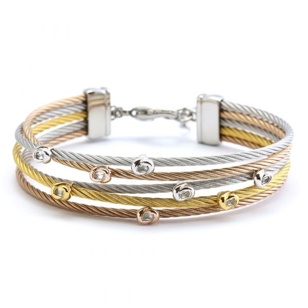 8朵精緻的花朵與這只Malia手鐲的3條彩色鋼索相配。它安裝在2mm的鋼纜上,巧妙地將白色托帕石的象徵性脆弱性和優雅與銀和鋼的強度相結合。項鍊,手鍊,戒指和半圈形耳環都是所有年輕而快樂的作品,是添加到時尚的花卉套裝中的理想配件。