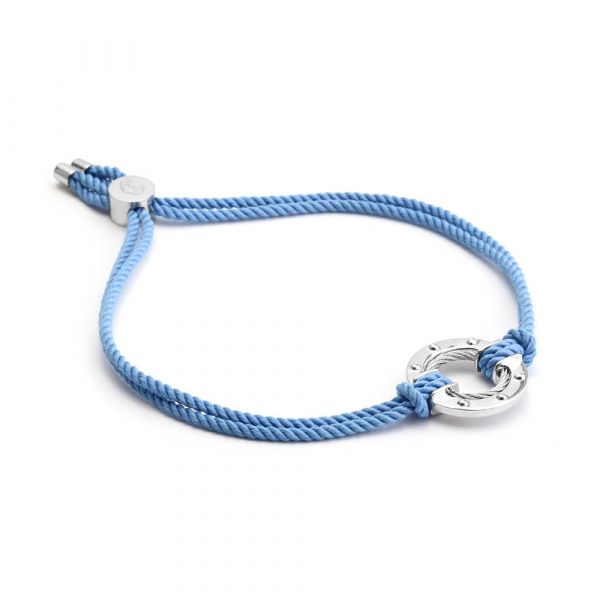一款時尚清新的手鍊,靈感來自海洋世界及其令人回味的造型。甲 程式化 孔口被精細純銀通過1.5mm不銹鋼鋼索圈工作和完成。藍色的繩子像繫泊繩一樣,完美地展現了這枚珠寶 作品的現代和中性風格 。