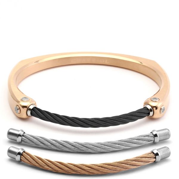 變色龍搖滾憑藉其神秘而優雅的清醒感,在外觀上發揮作用,並成為必備品。那些希望在人跡罕至的地方表達自己風格的人們的城市珠寶系列。弧形設計的不銹鋼玫瑰金PVD手鐲,帶緞面塗層和6個白色黃玉(2.5mm),結合3種Charriol可互換的3.5 mm不同鋼索的強度,可作為多功能連字符:黑色PVD,經典Charriol顏色上的一種,玫瑰金PVD。適用於S到L尺寸的女士。