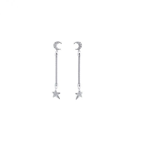 這款長銀不銹鋼鋼索吊墜耳環將月亮月牙和星星風格的裝飾品與32種不同大小的白色托帕石鑲嵌在一起,以表達您的天性。從黎明到黃昏,它們都會暈眩您的臉。這款新的Charriol星座圖案通過沉思和與時俱進的新靈感突顯了這款珠寶的純粹和簡約設計。回到本質,標誌性Charriol鋼索令人放心的礦物質與銀,鋼和寶石的存在相融合,創造出自然的滲透感,提醒著Charriol女人應有天體珠寶……用珍貴的星塵圍繞她。