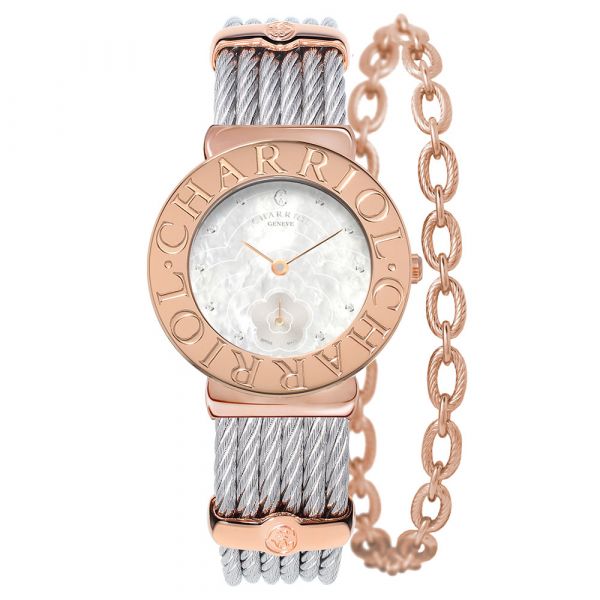 “每個ST-TROPEZ™手錶手鍊的標誌是其開放式手鐲設計。每個手錶手鍊均裝飾有一對裝飾夾,並配有獨特的ST-TROPEZ™鏈手鍊,並配有安全鍊和表扣。 。所有CHARRIOL鋼索均在La Chaux-de-Fonds車間由瑞士生產,並使用獨家的不銹鋼和鈦合金製造,在嚴格的生產過程中經過防過敏處理,也用於醫療領域,並符合ASTM International A967-01標準。”