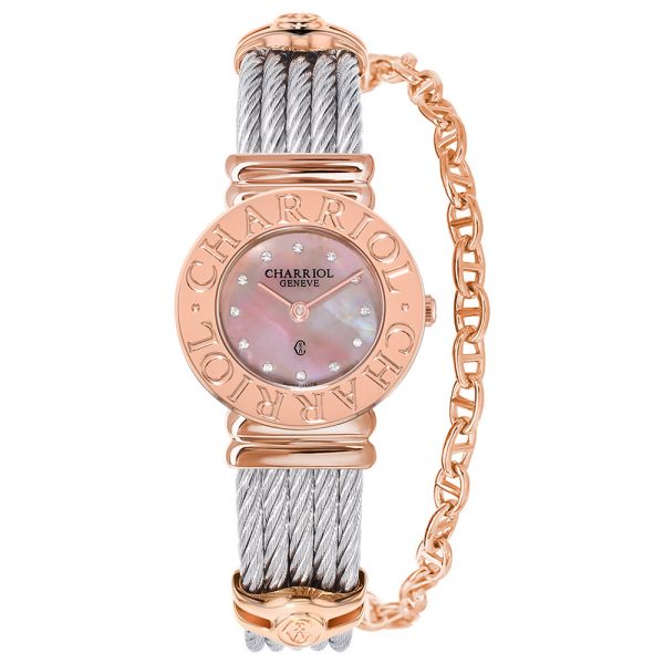 備受喜愛的ST-TROPEZ®手錶系列帶您前往法國里維埃拉(River Riviera)曬太陽。這款漂亮的瑞士製造石英鐘錶散發女性魅力,在錶帶上飾有我們標誌性的編織纜繩圖案,以及一個額外的鍊式手鍊,為設計增添了獨特的珠寶氣息。它充滿了優雅和精緻,採用玫瑰金鍍層和不銹鋼製成,並帶有白色珍珠母貝錶盤,並飾有12顆氧化鋯石。一款經典的女士手錶,彰顯了Charriol的藝術風格。可以調節尺寸以找到最合適的穿著,錶帶的防過敏效果。