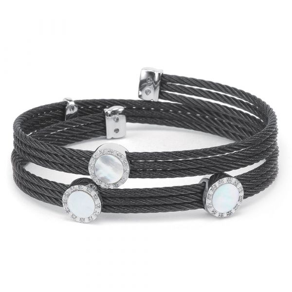 這款新穎的TWIST常春藤不銹鋼手鐲具有自信的女性氣息,其靈感來自常春藤的忠誠和永生的象徵意義,與自然完美地“聯繫”在一起。獨立安裝的獨特3根黑色不銹鋼黑色PVD鋼索(2毫米)手鐲纏繞在手腕上一圈,完美的自由和舒適。它長35厘米,帶有引人注目的礦物風情線條,飾有4個圖形化且富有詩意的珍珠露珠,並飾有48個白色托帕石(1.2毫米)。狂野而原始的珠寶,充滿獨特的唯美主義意識和原創設計,以表達這位Charriol女人美麗而強烈的本性。