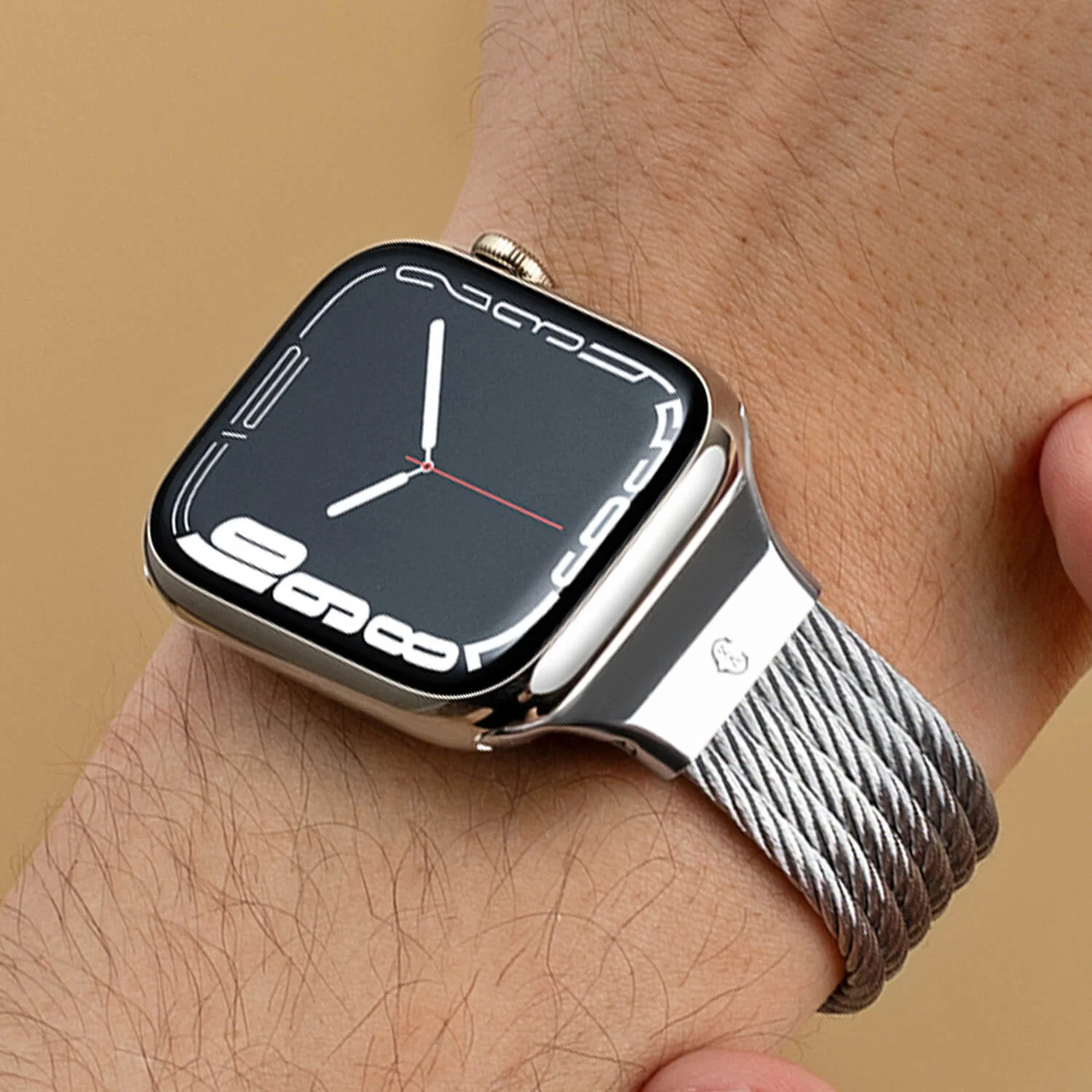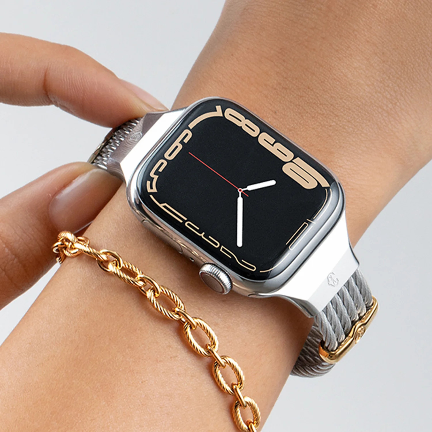 隆重介紹夏利豪 (Charriol) 的 Apple Watch 錶帶,我們的經典雙絞線經過更新,適應現代數位時代。 這款獨特而柔美的手鍊由 6 條不鏽鋼纜繩製成,飾有 2 個鏤空黃金 PVD ​​鋼元件和一條帶安全扣的精美黃金 PVD ​​鏈條,是精品與科技的結合。